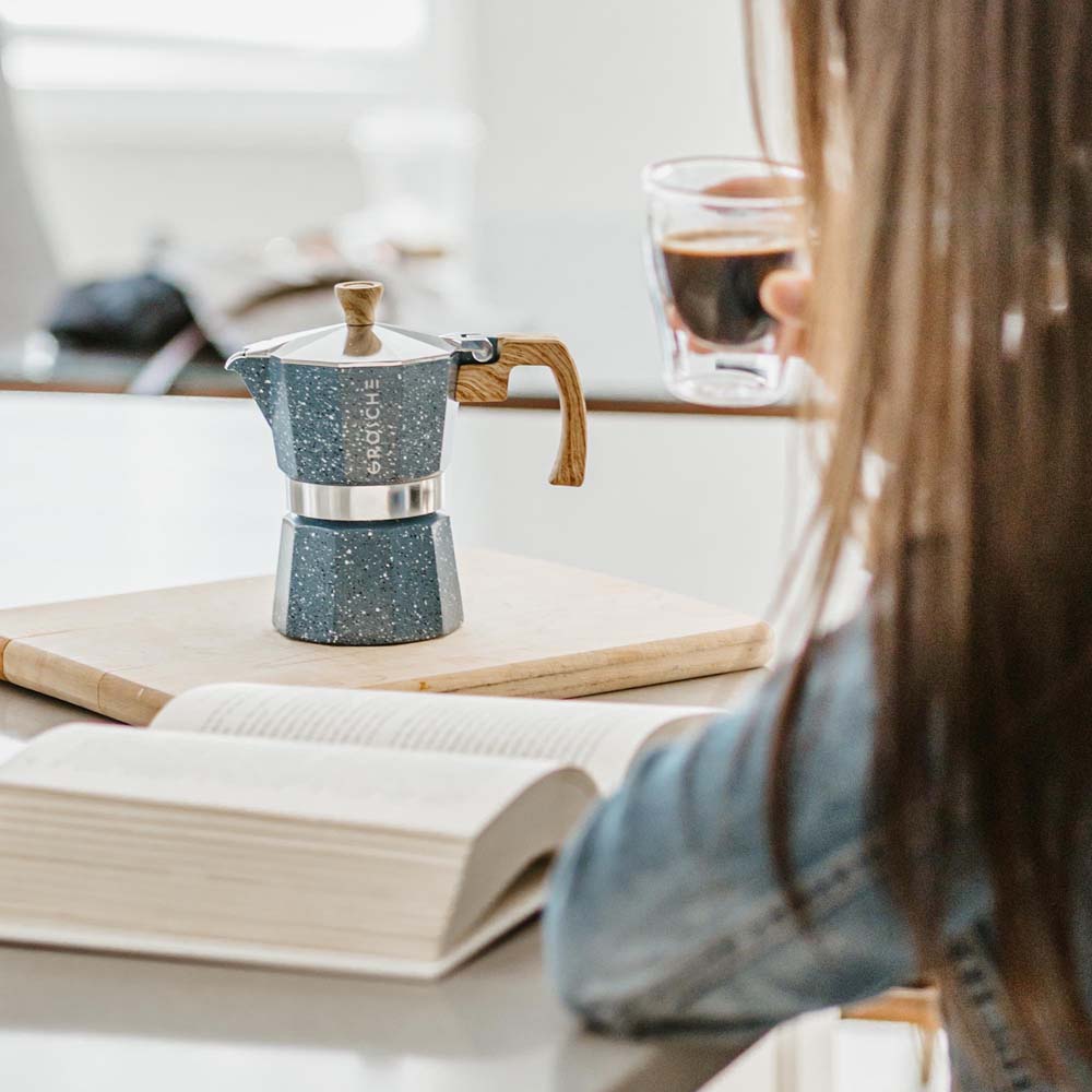 La cafetière moka Grosche existe en plusieurs formats 3 tasses : 150 ml ou 6 tasses : 275 ml